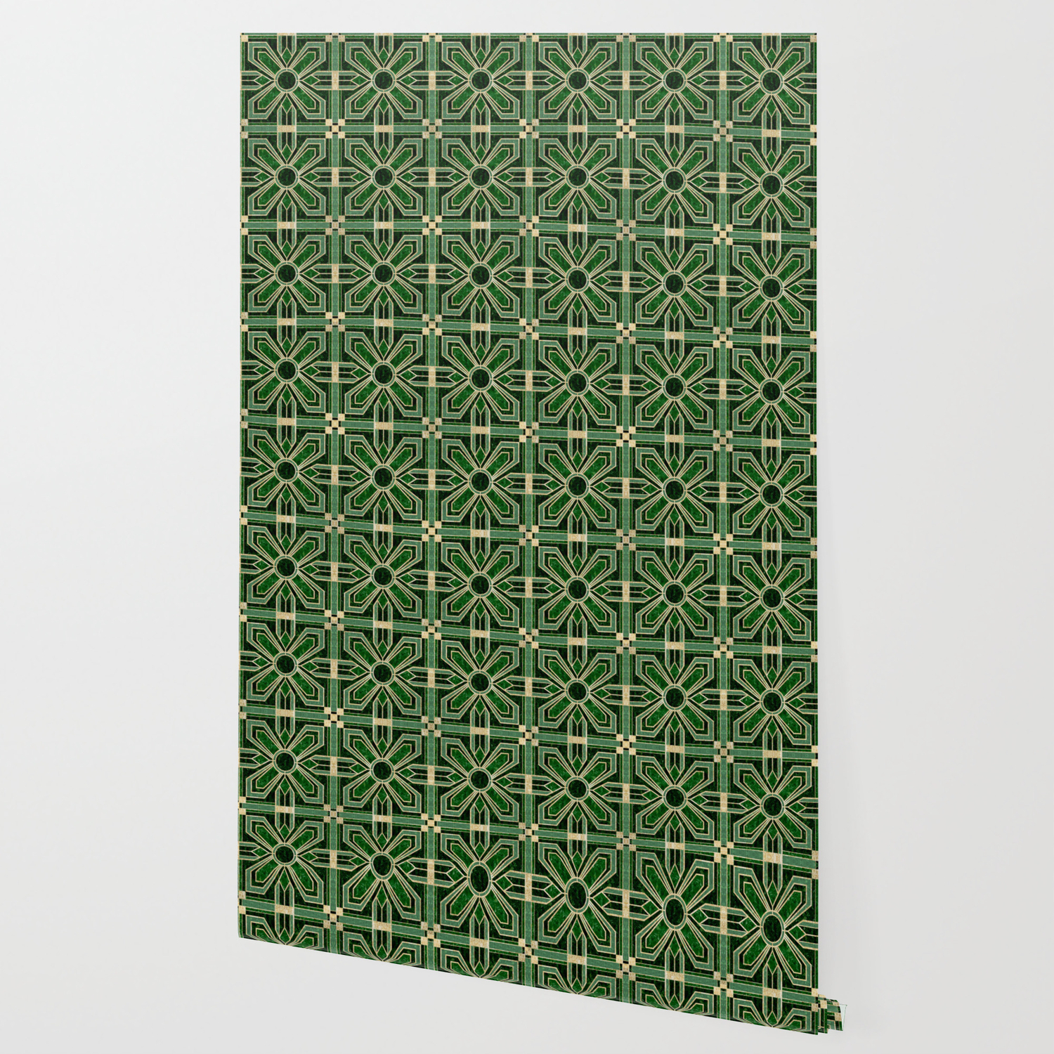 Art Deco Floral Tiles In Emerald Green And Faux Gold Wallpaper By