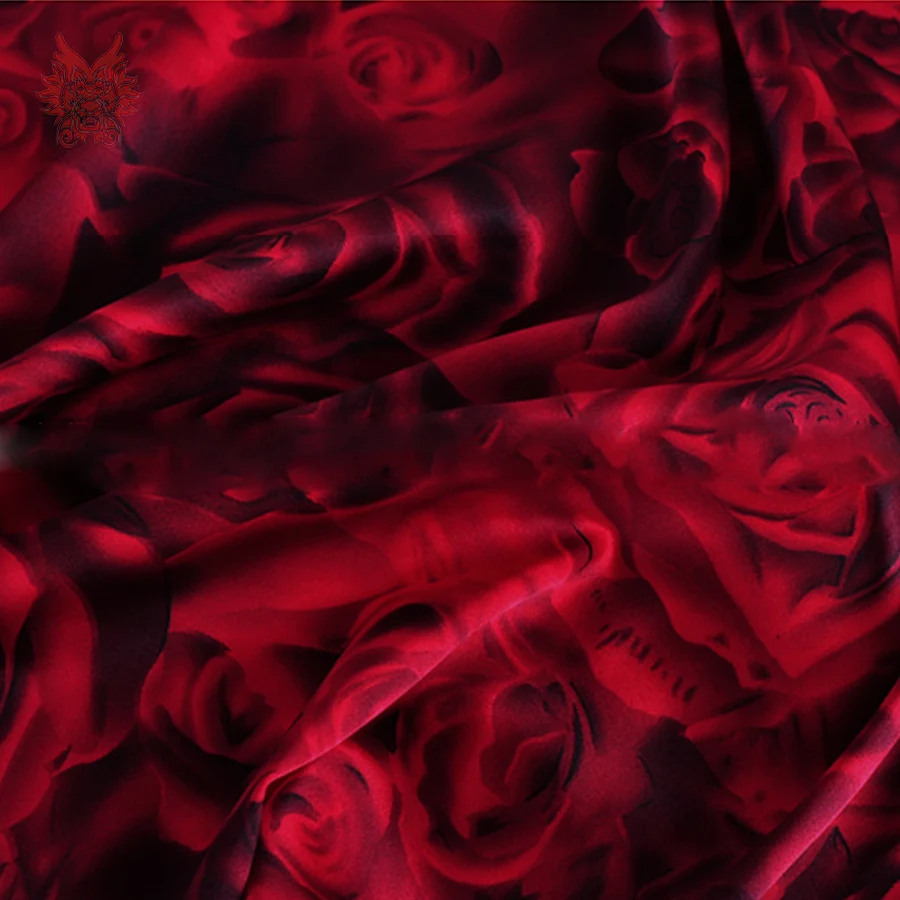 Designer Luxury Red Rose Print Spandex Silk Satin Fabric For