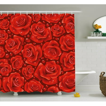Rose Shower Curtain Vivid Red Roses Rain Water Drops Graphic Dewy Meadows Inspired Romantic Pattern Fabric Bathroom Set With Hooks 69w X 70l